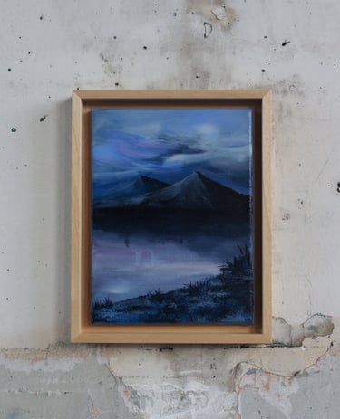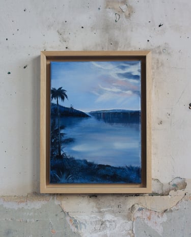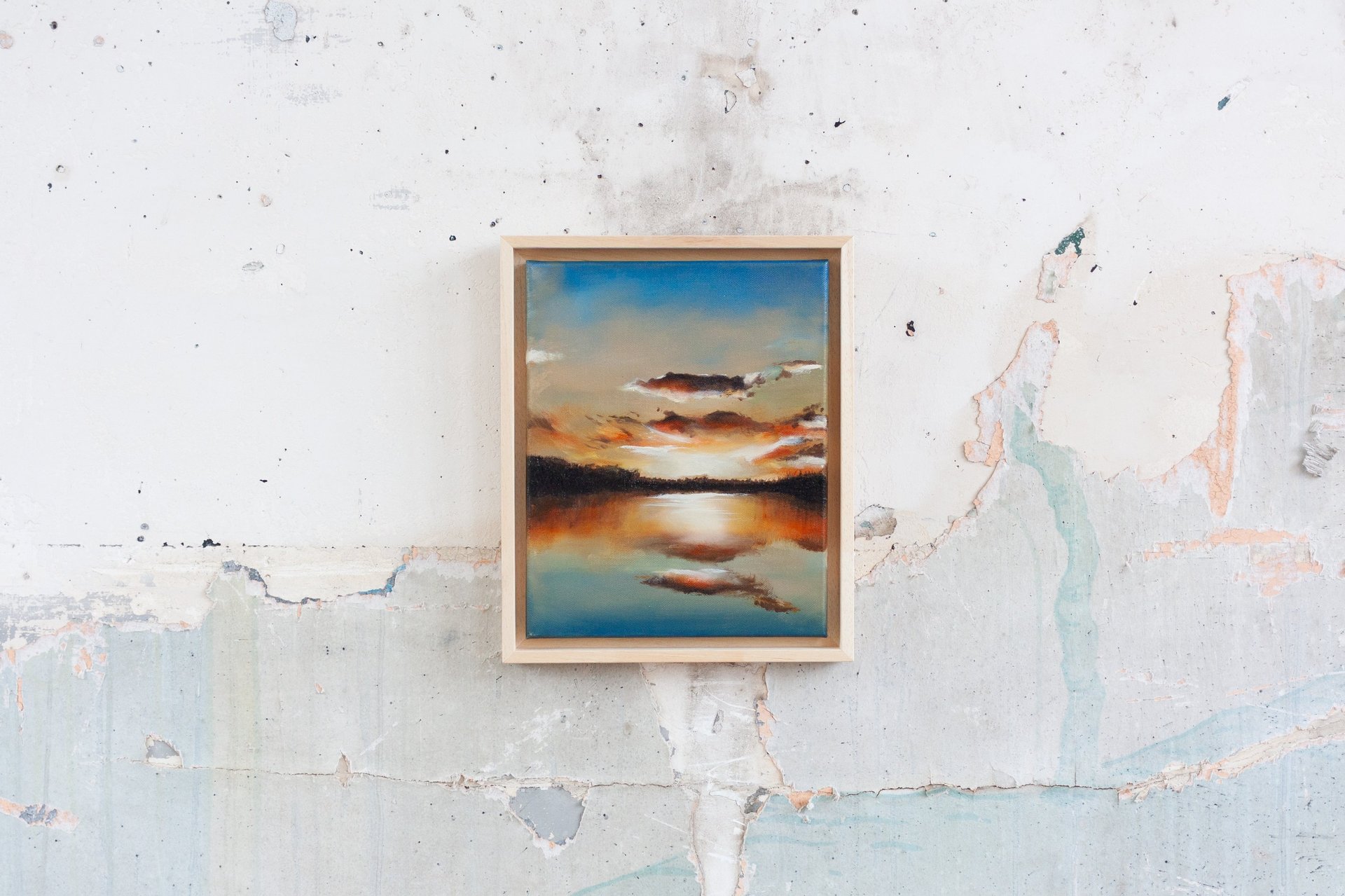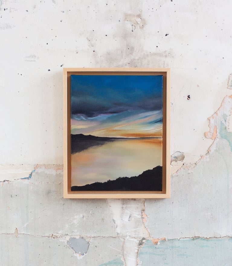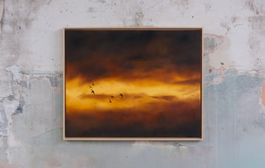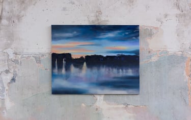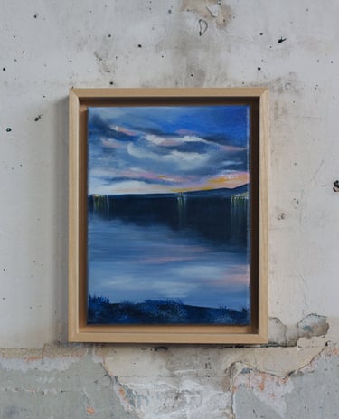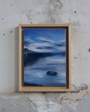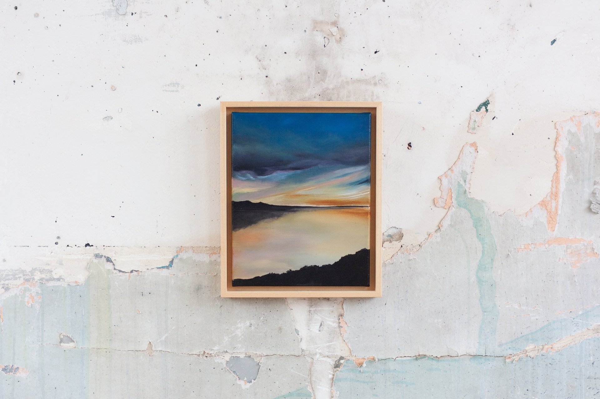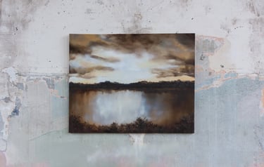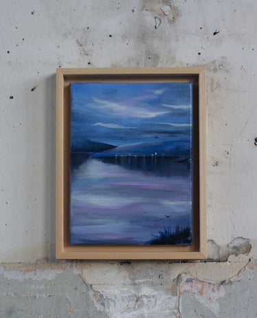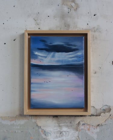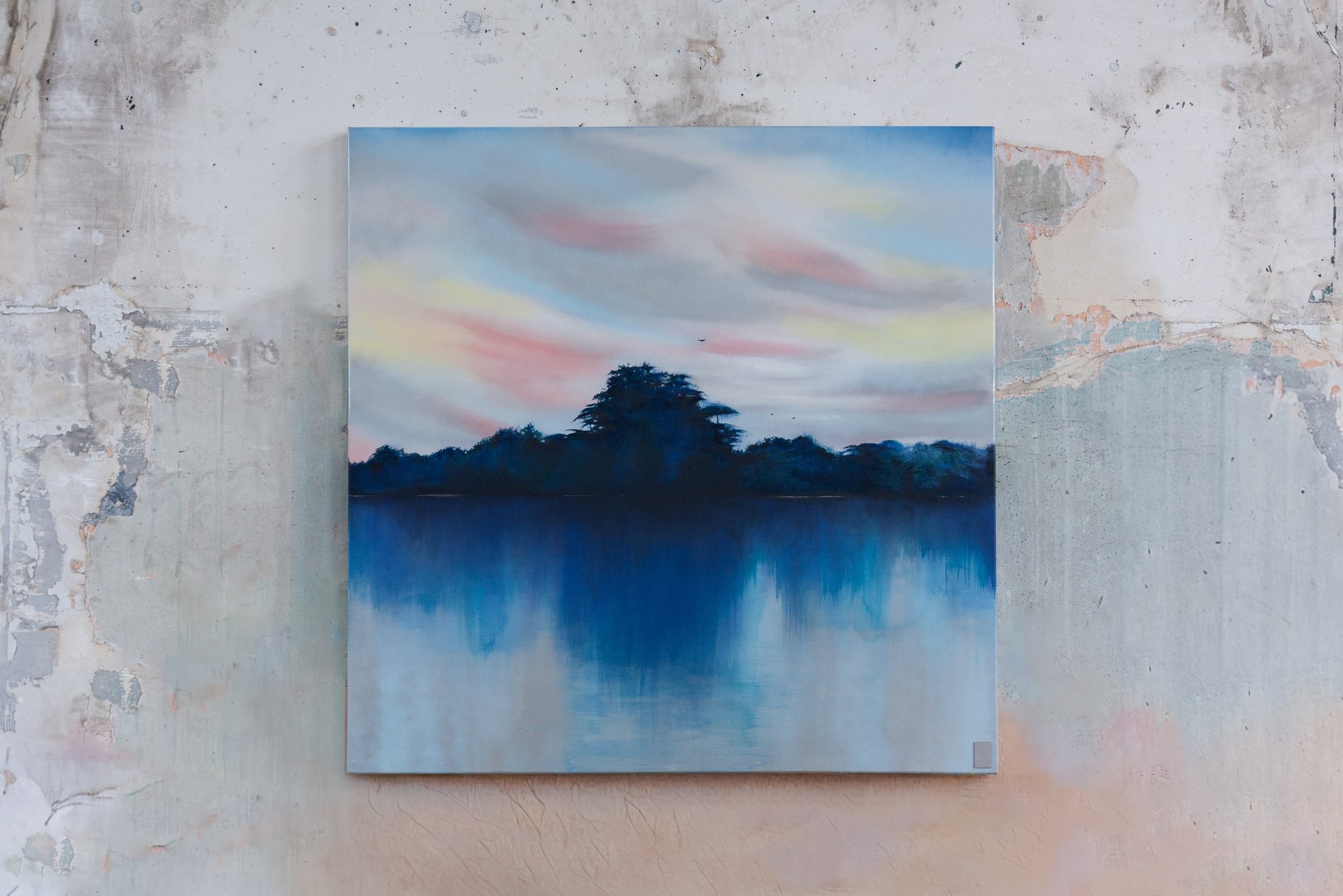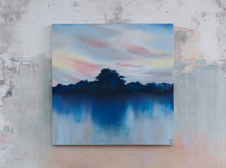 Je peins cette ligne envoûtante où le ciel bascule dans l’eau, où la lumière hésite entre le jour et la nuit. Techniques mixtes d’hier et aujourd’hui comme pour fusionner traditions et modernité. Quelques silhouettes d’oiseaux ponctuent les compositions comme des accents calligraphiques.