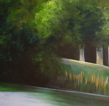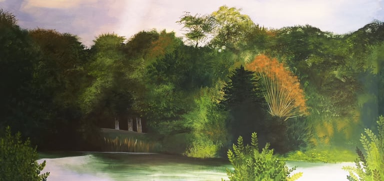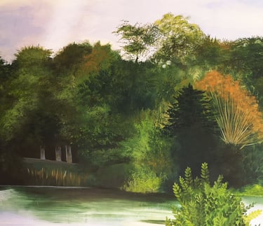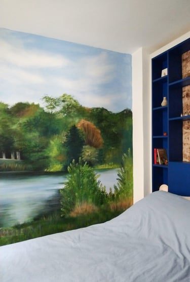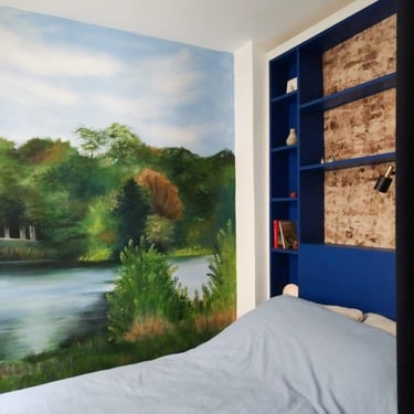 Pour leur pied-à-terre parisien, des clients originaires de Londres m'ont confié la réalisation d'une grande peinture murale pour agrandir l'espace de la petite chambre de 4m². Inspiré de Richmond Park, ce trompe l'oeil invite à la sérénité et donne une touche unique à l'appartement.