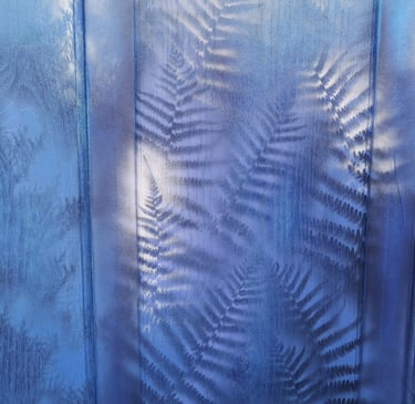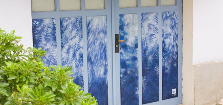 jeux d'ombres sur une porte en bois realisés avec de vrais végétaux