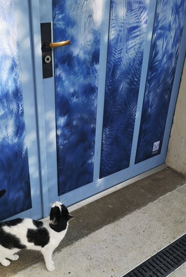 Une réalisation sur demande pour embellir une porte de garage terne et un peu usé. Un trompe l'œil très Nature a prit vie sur cette porte et vient prolonger le jardin.