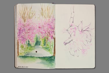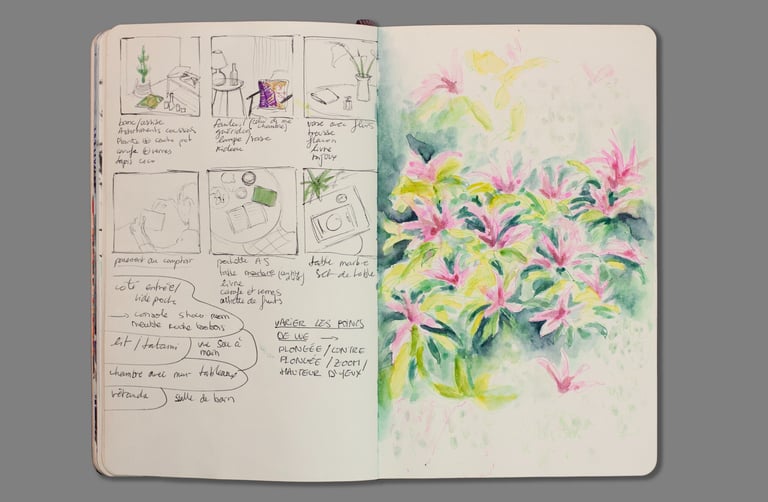 Artiste plasticienne et diplômée des métiers d’art, je me suis d’abord exprimée à travers la création d’objets en métal et d’accessoires illustrés. Mon travail s’est ensuite enrichi au fil des années, intégrant progressivement l'aquarelle, la peinture et la photographie. Aujourd’hui, mon approche mêle ces différents mediums, sans oublier les carnet de croquis, qui jouent un rôle essentiel dans ma démarche artistique.